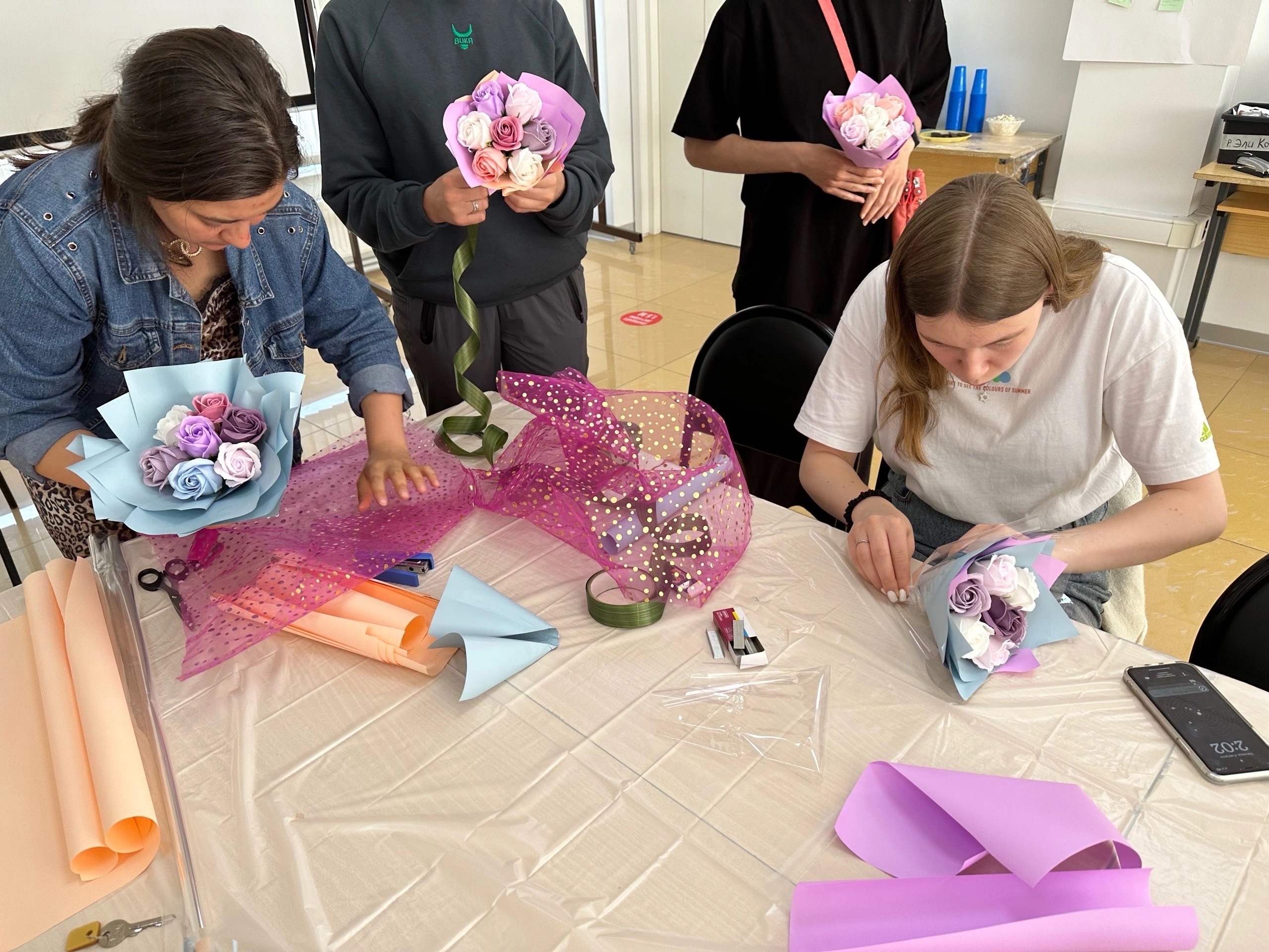 • Под руководством опытного мастера участники приступают к созданию своих собственных букетов из мыльных роз.